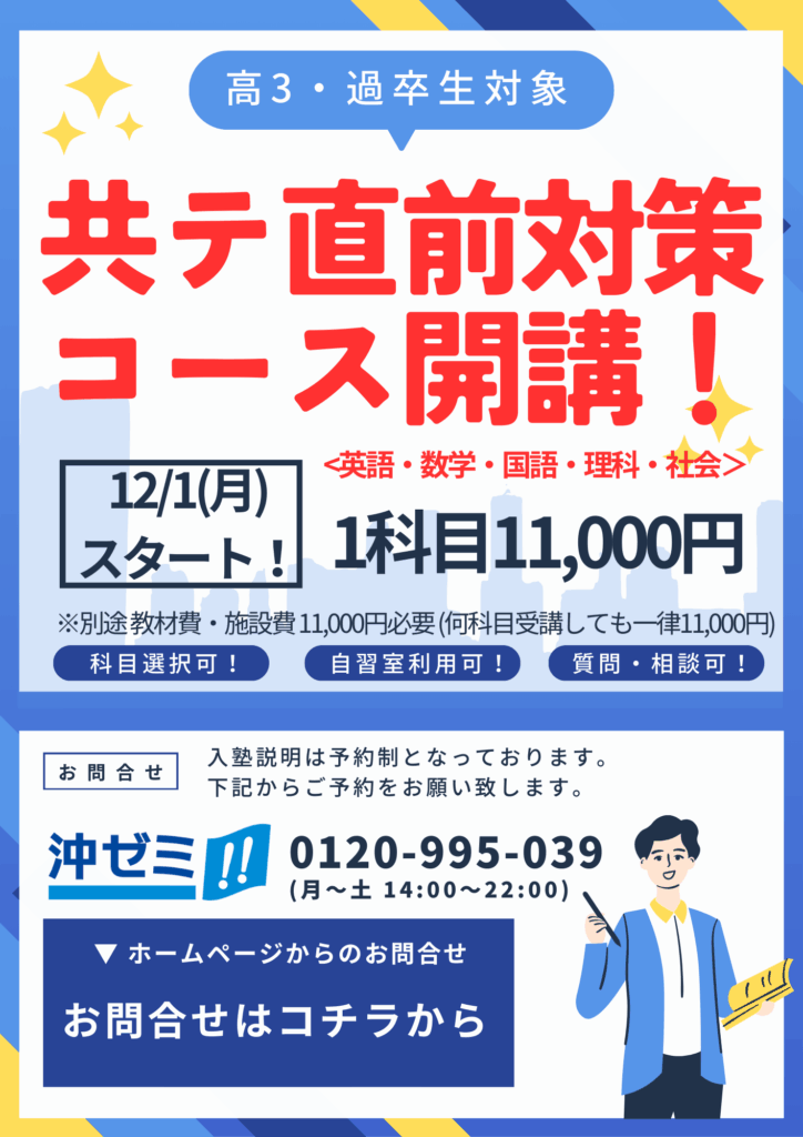 共通テスト直前!多くの受験生を合格へと導いてきた沖ゼミの共テ直前対策であと一伸びをして、志望校合格を掴みとろう。申込受付中。