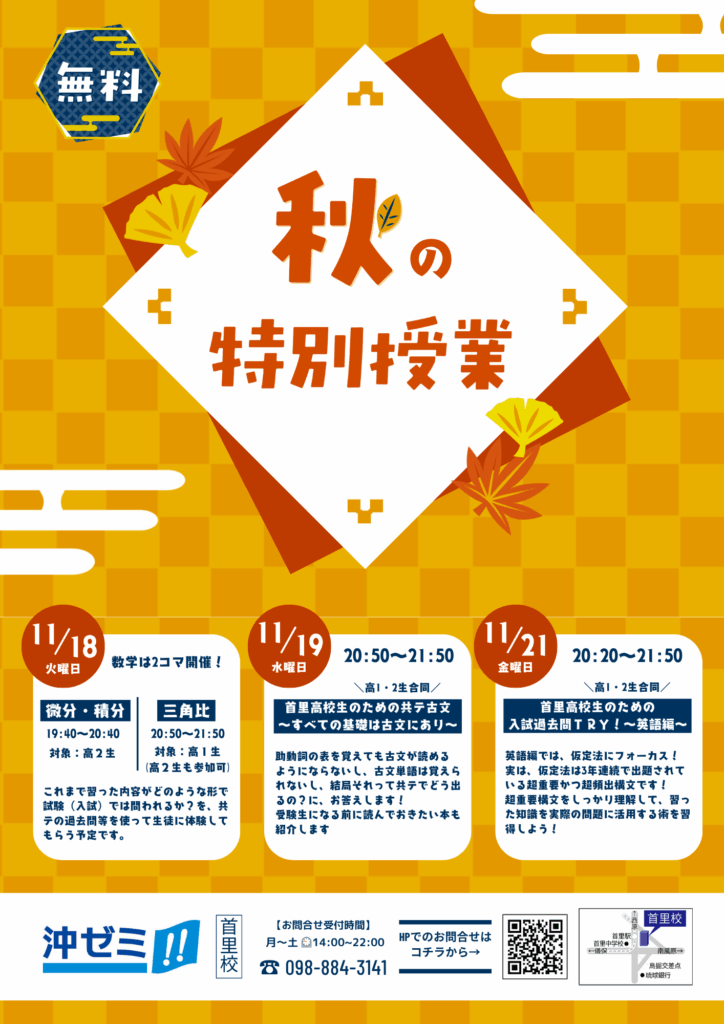 【首里高1・2生】11/18(火)から始まる秋の特別授業に参加しよう🍁👩🏫