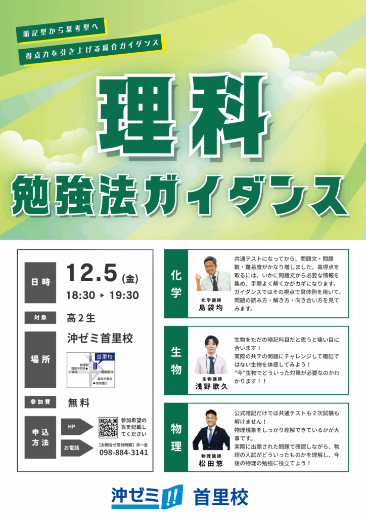 ⇒「理科勉強法ガイダンス」参加希望の旨をお伝えください。