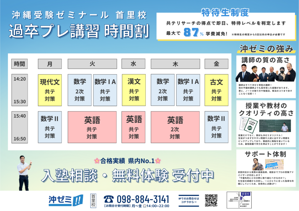 沖ゼミ首里校で、過卒生対象のプレ講習が始まります!今年の受験を踏まえたアドバイスや志望校への合格プラン、プレ講習の無料体験など、随時受付中です😊